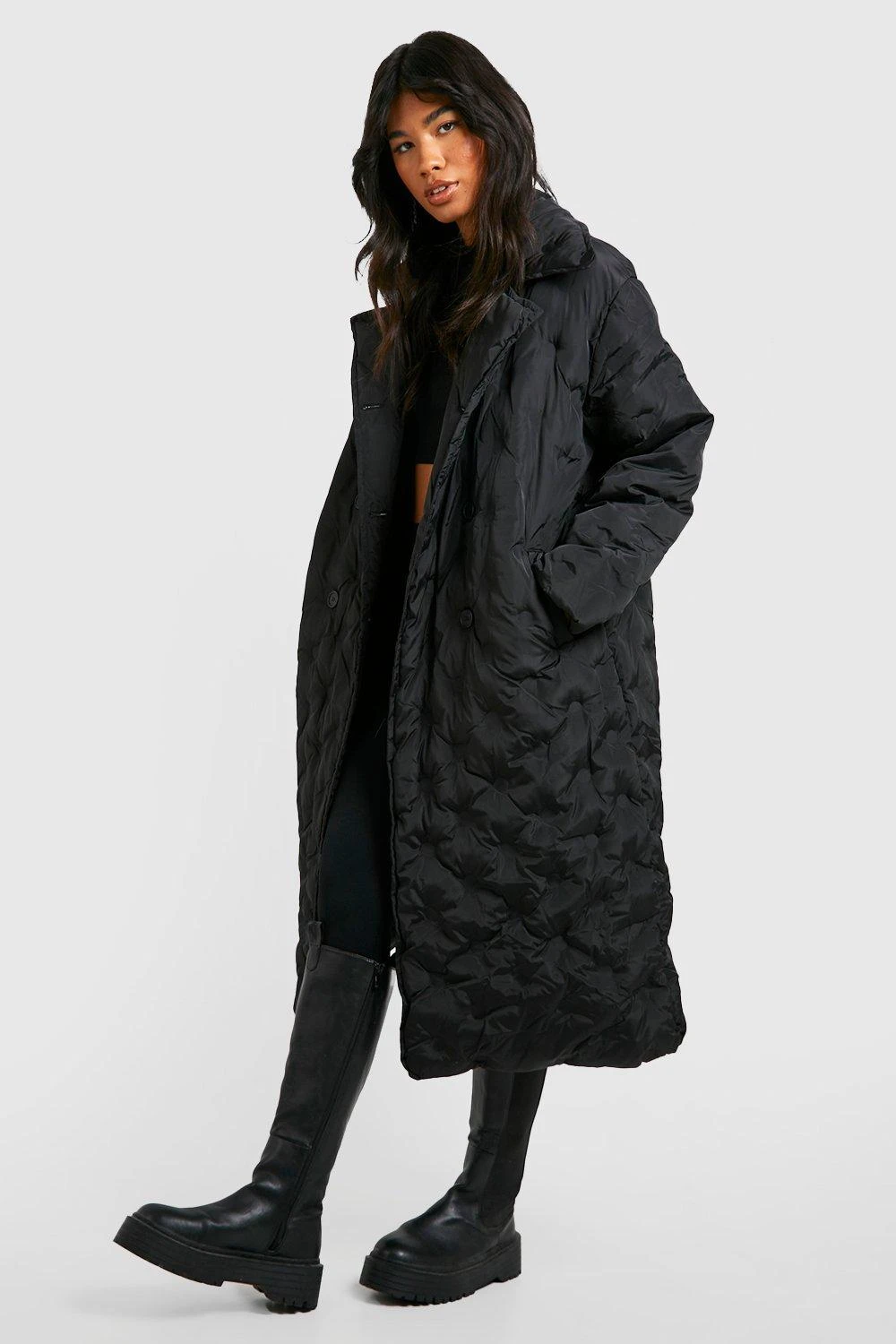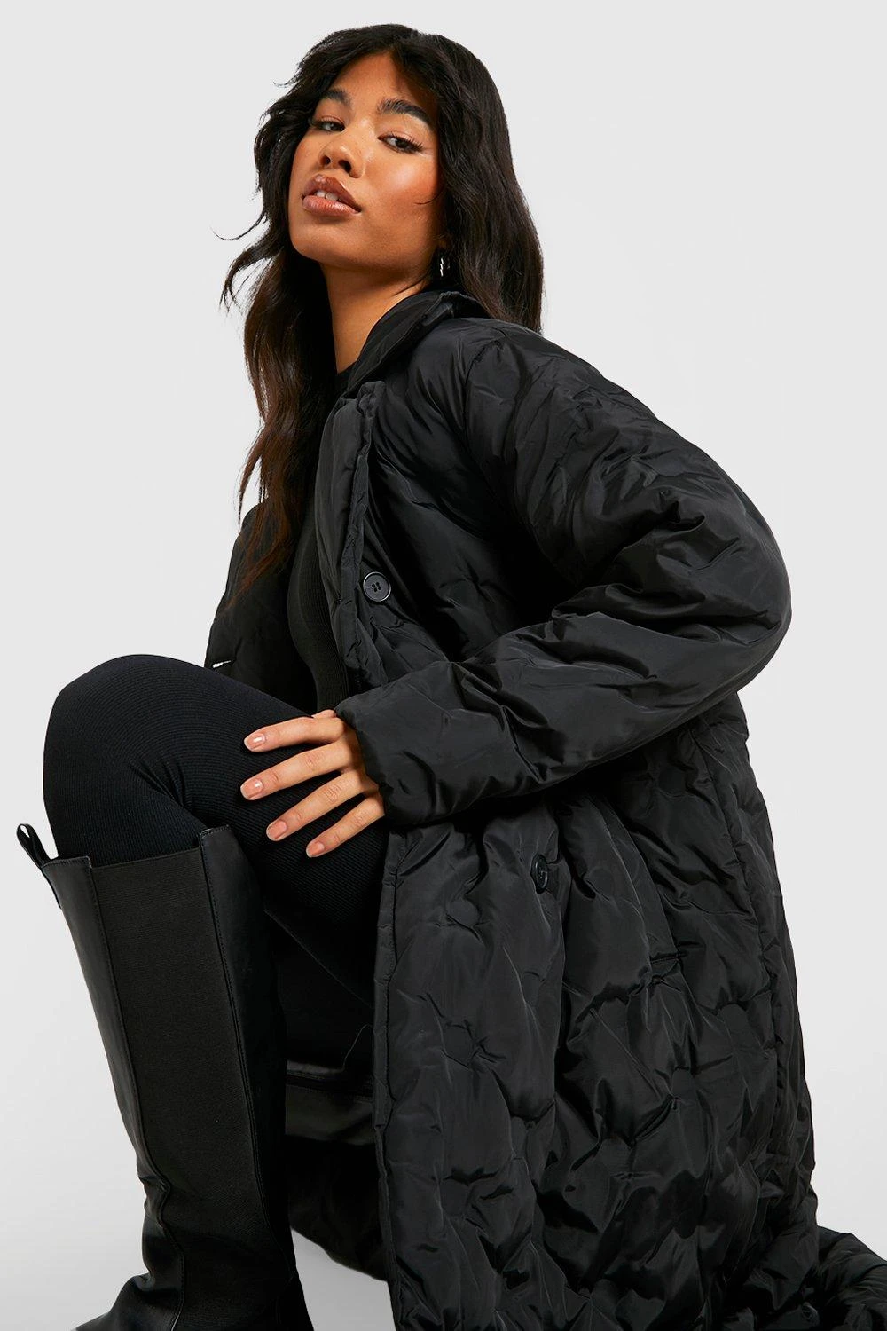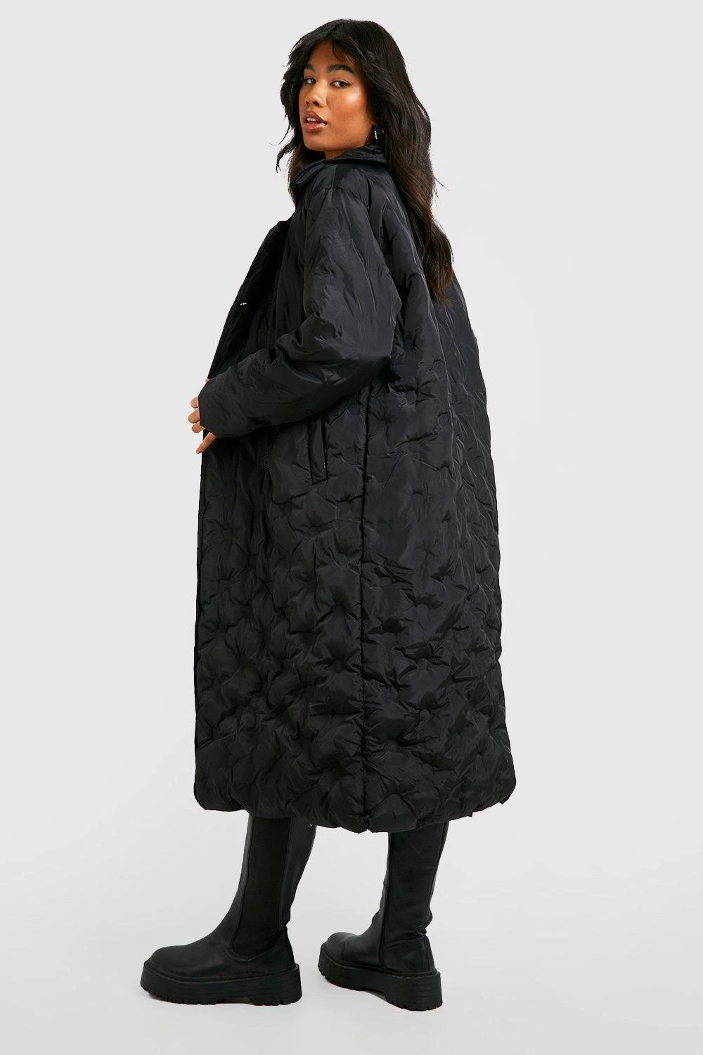 100% Polyester, 100% recycelte Füllung. Nur chemisch reinigen. Das Model trägt Größe 38